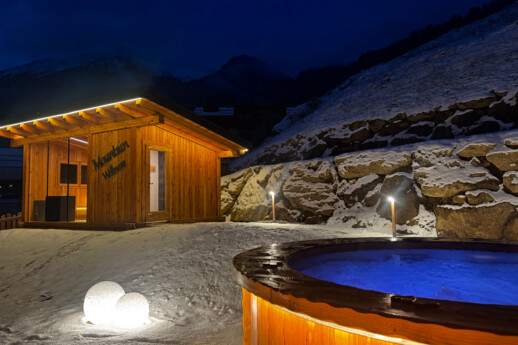 - Tinozza idromassaggio esterna: un’esperienza unica sotto il cielo alpino, immersi nell’acqua calda con vista sulle montagne.